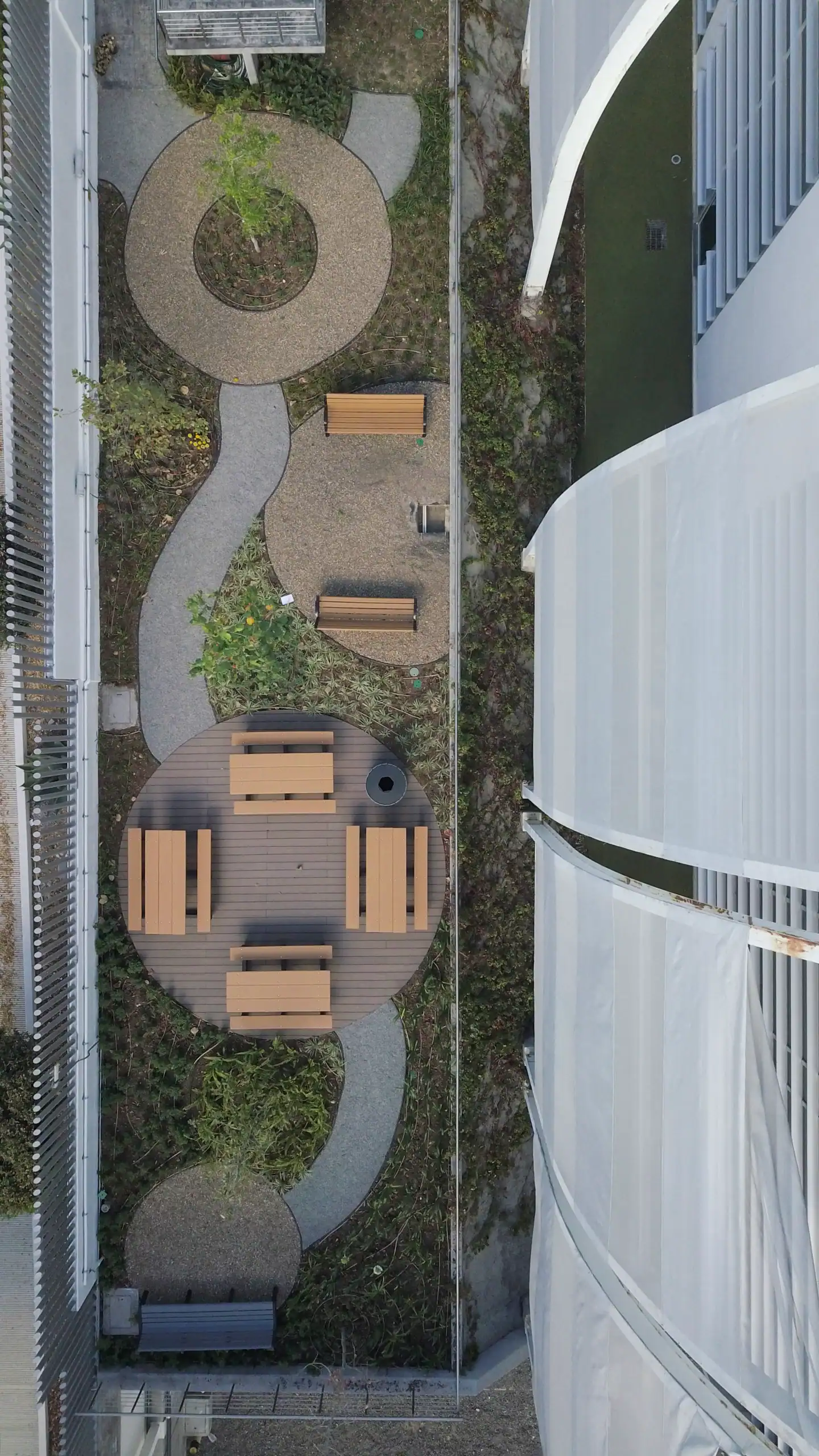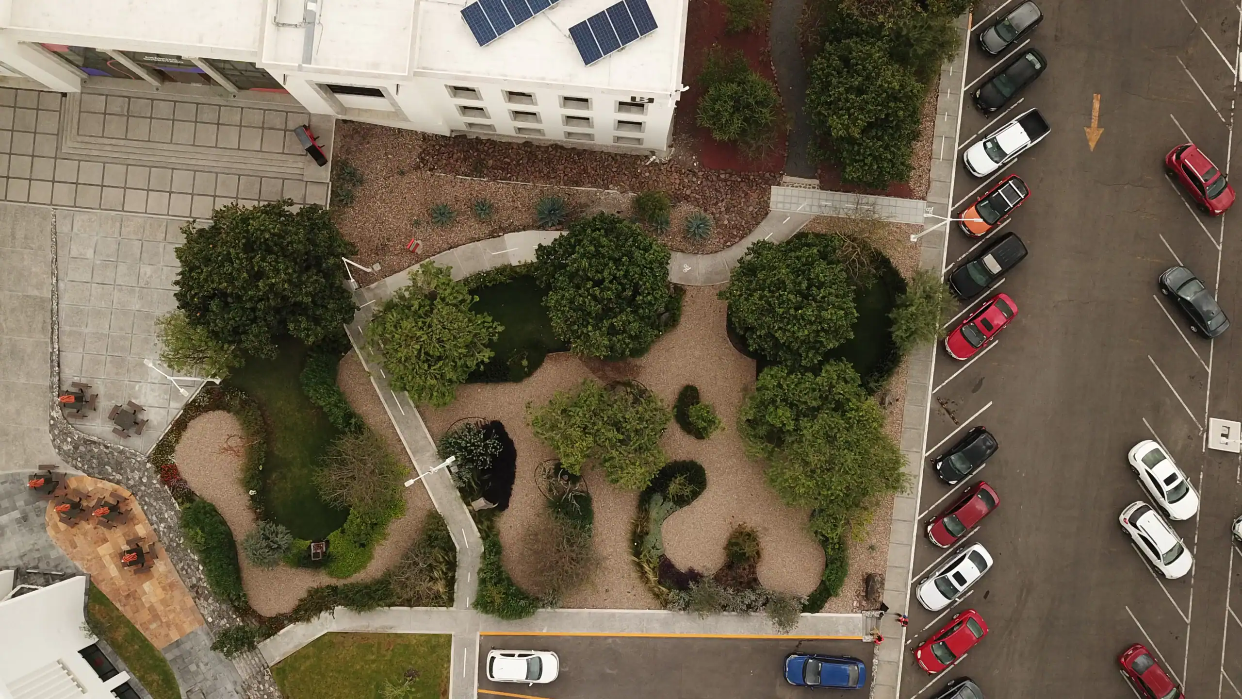 Proyecto de Paisaje Industrial donde se minimizó el consumo de agua a través de gravas y se generaron diversos espacios de sombra a través de diferentes tipos de árboles que permiten a los usuarios trabajar o relajarse en el jardín a cualquier hora del día.